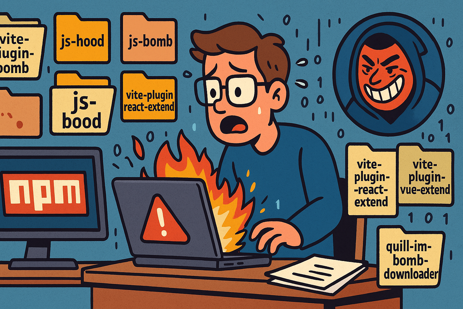 A terminal window with red warning text and broken JavaScript icons symbolizing malware in code packages
