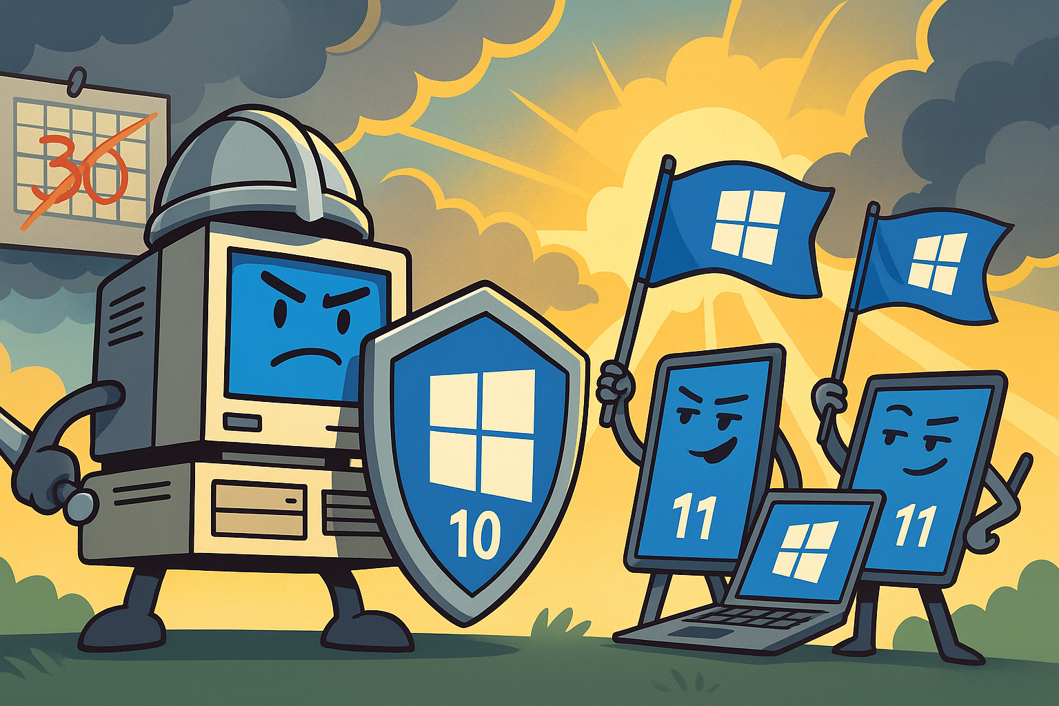 A cartoon-style illustration showing an old desktop PC holding a shield labeled "Windows 10" while standing defiantly. Around it, sleek new laptops and tablets wave flags with the Windows 11 logo. The background hints at a battlefield, symbolizing the ongoing fight for relevance and support in the Windows ecosystem.